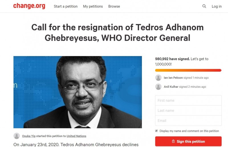自武肺在年初爆发以来,WHO一开始先否认武肺会人传人,接着还把武肺在全球列为中等风险,等到疫情开始蔓延全世界,当局还是坚持不把它列为「大流行」。直到3月11日有超过110个国家爆发确诊,超过4000千人死亡时,WHO才迟迟把疫情宣布为「全球大流行」,瞬间引起大众反弹,纷纷认为WHO在疫情上处理不当才会导致全球沦陷,加上谭德赛的处理态度和行为一直饱受争议,因此网友们便在全球最大请愿平台发起连署活动,要求他下台,目前人数已接近目标100万人。