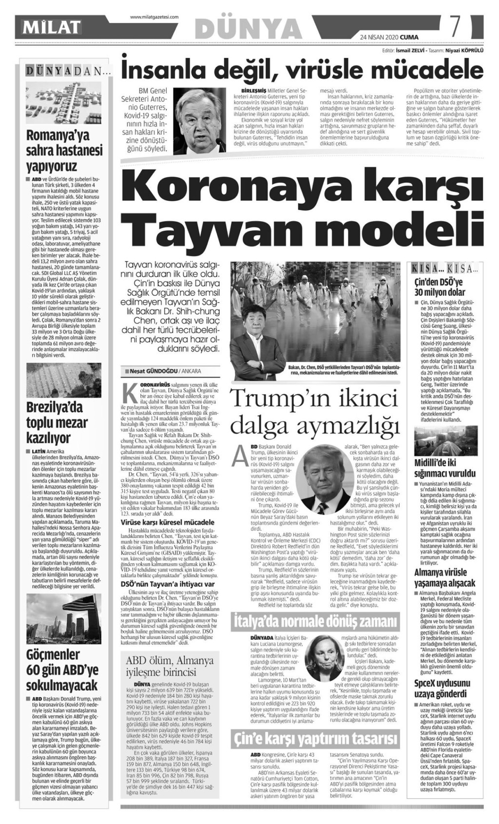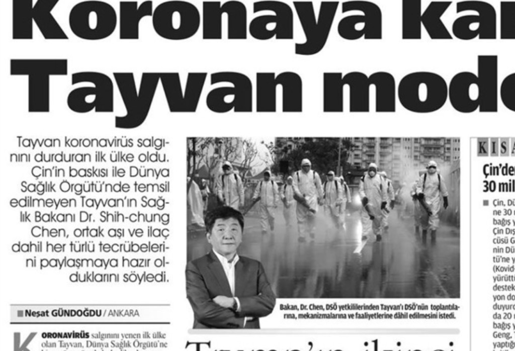 台湾防疫,全球有目共睹:防疫指挥官、卫福部长陈时中上周六(25日)登上土耳其主要媒体之一「纪元报」(MILAT)头版,标题为「台湾对抗武汉病毒的模式」,说明台湾对抗武汉肺炎(新冠肺炎、COVID-19)的超前部署,并呼吁国际支持台湾加入WHO。该报导内容强调:「台湾是第一个阻挡武汉病毒疫情的国家。因中国打压而无法参与世界卫生组织的台湾卫生福利部长陈时中表示,台湾愿意分享疫苗及药物在内的所有经验。」陈时中的照片放在最醒目的版面正中央。
