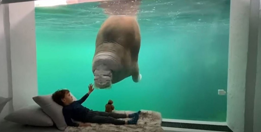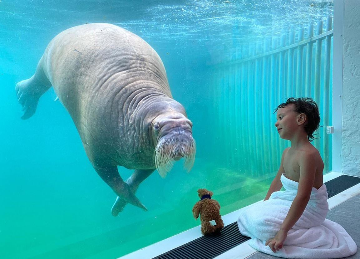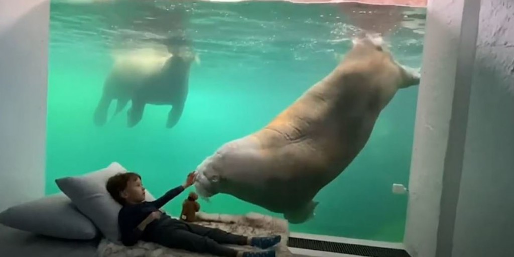當小男孩把手靠近玻璃窗時,海象還會慢慢靠近跟他互動,畫面超溫馨。