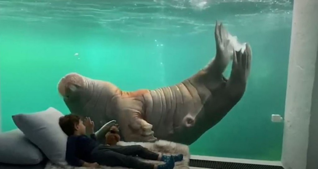 從曝光的畫面可見,一名小男孩就在飯店房間內悠閒地躺著,而且這期間還可以跟海象共處。