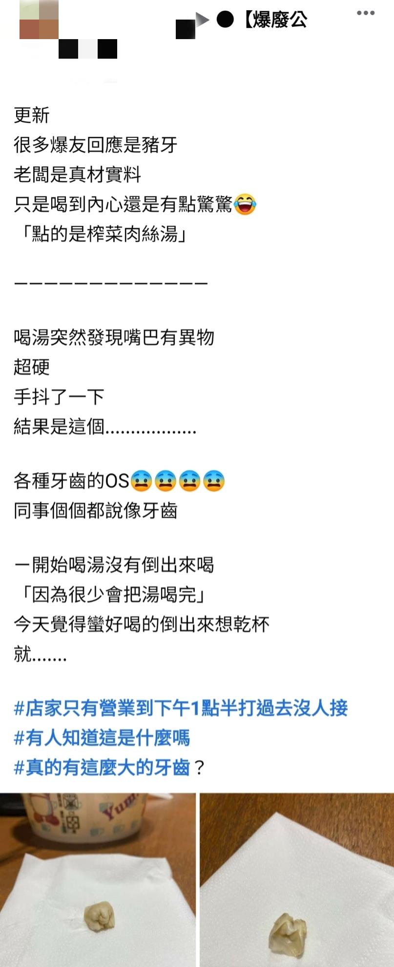 不知道你们有没有外食,却在食品中吃到不干净东西的经验呢?其实这种事情真的难免,如果只是不小心外部飞进去的小虫子,都还算可以接受,毕竟也不一定是店家的问题。不过最近一位网友在脸书「爆料公社」上发文表示,自己点的汤里竟然出现了「疑似牙齿」的东西,让他下了一大跳,立刻发文询问大家的意见。