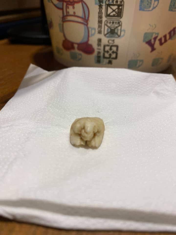 原PO在文中表示自己喝榨菜肉丝汤时,突然在嘴里感觉到一个超硬的异物,让她当下有点紧张。果然,她吐出了一个非常奇怪的东西,看起来就像牙齿一样。就连身旁的同事们也都认为这应该就是牙齿,让她非常紧张。