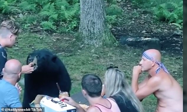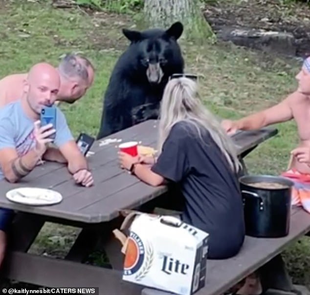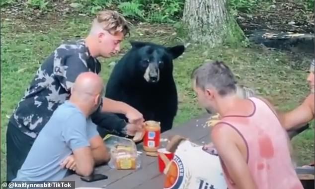 在凱特琳內斯比特 (Kaitlyn Nesbit) 發布在抖音的影片中,可以清楚看到一隻黑熊自然又放鬆的坐在野餐桌的邊緣,耐心地等待著,因為其中一個人正在幫牠製作好吃的花生醬三明治。29歲的內斯比特說,她週四與家人一起到當地野餐時,捕捉到了這個難得的一刻。她說他們其實是到朋友的小木屋去度假,朋友也曾經提醒附近有熊出沒,但從來沒有真正打擾過他們。