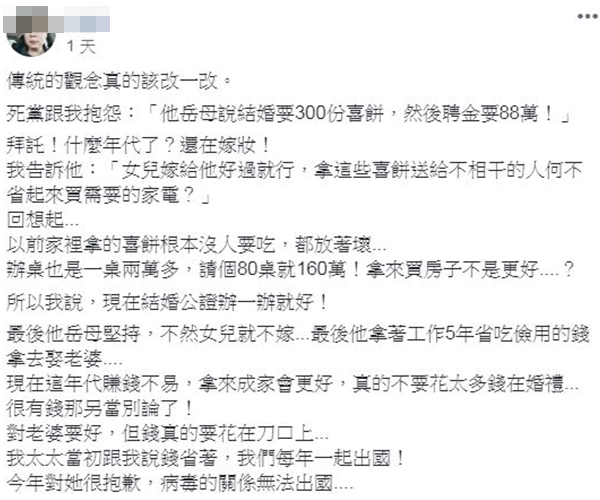 原PO在《爆怨公社》分享好友被準岳母要求「聘金要88萬、喜餅要300份」的故事,感歎「拜託!什麼年代了?還在嫁妝!」他告訴好友,女方嫁得好就行,與其花錢送喜餅給不相干的人,還不如省下來買需要的家電。原PO還指出,自己家裡當年辦喜事,訂了喜餅都沒人吃,最後還放到壞掉,另外宴客共花了160萬,「拿來買房子不是更好…?所以我說,現在結婚公證辦一辦就好!」但最後好友的準岳母還是堅持不收回條件,好友也只能用5年積蓄來娶老婆。