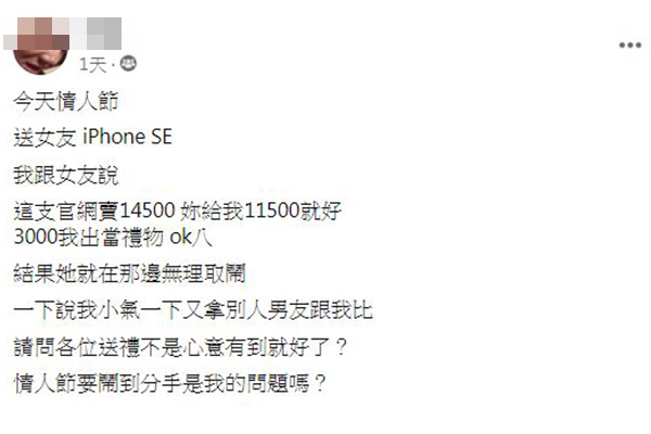 男網友在《爆廢公社》表示在七夕情人節送女友「iPhone SE」,原本應該是開心甜蜜的氣氛, 沒想到他竟向女友說「這支官網賣14,500,妳給我11,500就好,3,000我出當禮物,ok吧!」這句話一說出口馬上被女友怒罵他吝嗇,而且還拿他和朋友的男友做比較,原PO最後無奈詢問「請問各位送禮不是心意有到就好了?情人節要鬧到分手是我的問題嗎?」