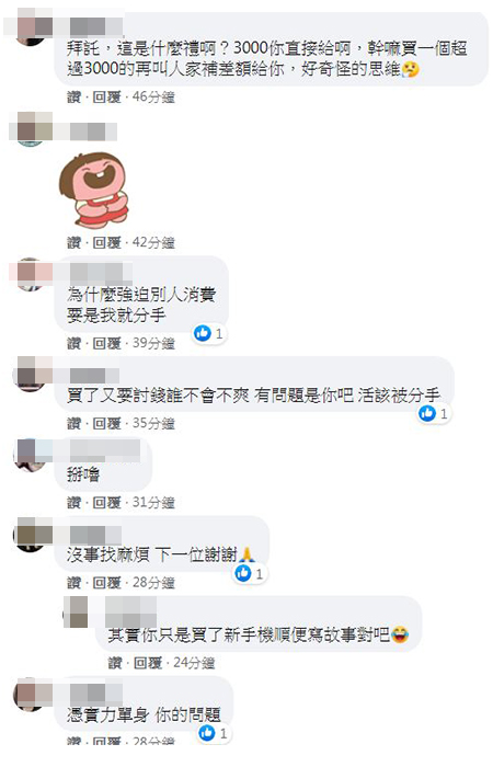 這篇看似討拍的貼文曝光後馬上因為關注,但網友卻一面倒怒罵男網友,「怎麼你這樣還有女朋友啊?」、「當然是女生的問題啊!為什麼還忍你到現在?傻了嗎?」、「活該分手,自己買對方不喜歡的手機,還說你只出3000,到底為什麼對方要莫名其妙給你剩下的金額?根本強迫消費不叫送!」、「買了又要討錢誰不會不爽 有問題是你吧 活該被分手」、「憑實力單身,你的問題」。