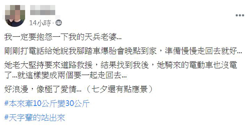 原PO在《爆怨公社》表示騎腳踏車回家時突然爆胎,於是馬上聯絡老婆說會晚點回家,沒想到對方卻堅持要騎電動機車來救援,「結果找到我後,她騎來的電動車也沒電了…」兩人就這樣一起牽車走回家,原PO最後還寫到「好浪漫,像極了愛情… (七夕還有點應景)」、「本來牽10公斤變30公斤」。