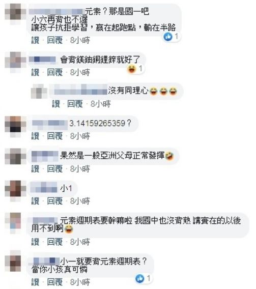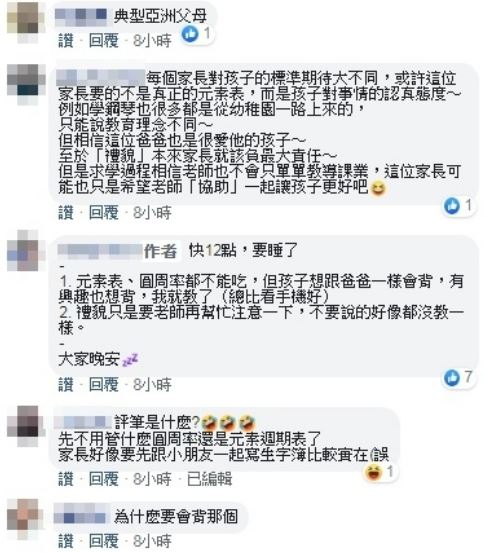 貼文曝光後馬上引起網友熱議,大家的看法也很兩極,有網友大讚原PO教育孩子的態度,「我的作法是順其自然,但是你這個爸爸也不賴,對孩子有期許,也是為孩子好」、「每個家長對孩子的標準期待大不同,或許這位家長要的不是真正的元素表,而是孩子對事情的認真態度」,也有網友認為這個做法太超過,「小一就要背熟元素週期表也太誇張了⋯」、「我看到覺得你小孩壓力好大」、「我有沒有看錯?你這比恐龍還恐龍」、「填鴨式教育的家長真可怕」。