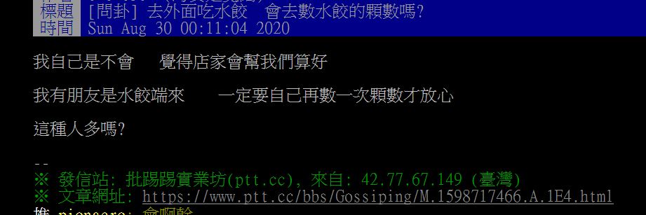 水餃容易料理又有很多樣化的餡料,是不少民眾非常喜愛的食物。最近就有網友想知道大家吃水餃的習慣,在《PTT》發問:「去外面吃水餃,會去數水餃的顆數嗎?」他表示自己是不會數的,但有朋友每次吃之前都要一顆一顆數才放心吃,讓他很好奇「這種人多嗎?」