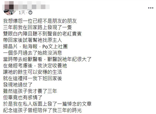 原PO在《爆怨公社》表示3年前在路边捡到这只红贵宾,由于一直找不到牠的主人,加上医生表示牠的年纪已经很大,于是原PO决定收养牠,让牠渡过晚年。没想到原PO上周一下班回家时却发现爱犬已经没有心跳,毛孩最终在家安详离开,她也不舍地在脸书发了悼念文,「虽然这孩子我才养了三年,但毕竟也有感情了」。