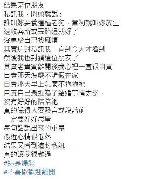 原PO表示自己一开始很自责当天应该请假在家多陪爱犬,没想到随后却收到一名朋友私讯狂酸「谁叫妳要养这种老狗,当初就叫妳放生,送收容所或丢路边就好了,没事给自己找麻烦」,让她心情再次受打击,事后也封锁了对方,她最后也提醒大家「真的觉得人要发言或说话前,一定要好好思量,每句话说出来的重量。」