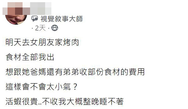 原PO在《爆廢公社》表示中秋節跟女友家烤肉,自己雖然負擔全部食材費,但卻有一部分的食材費想要跟女友家人索取,「活蝦很貴……不收我大概整晚睡不著」,他還問網友這樣會不會太小氣。