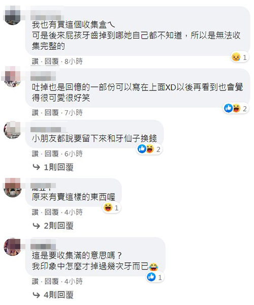貼文曝光後紛紛引起網友們的共鳴,很多爸媽級的網友也分享自己的經驗,「兒子怕看牙醫 掉第二顆門牙幫他拔她一邊拔一邊哭 結果吞下去了!!!」、「我家小孩也有留著」、「我也有買這個耶~但是我想我應該也是沒辦法收集完成~太難預料小孩發現斷牙會怎麼樣了」、「我也是用這個」、「還好是吐掉,如果不小心吞下去,媽媽可能要去找便便了」、「我也有買這個收集盒ㄟ,可是後來屁孩牙齒掉到哪她自己都不知道,所以是無法收集完整的」。