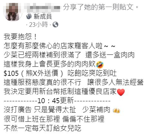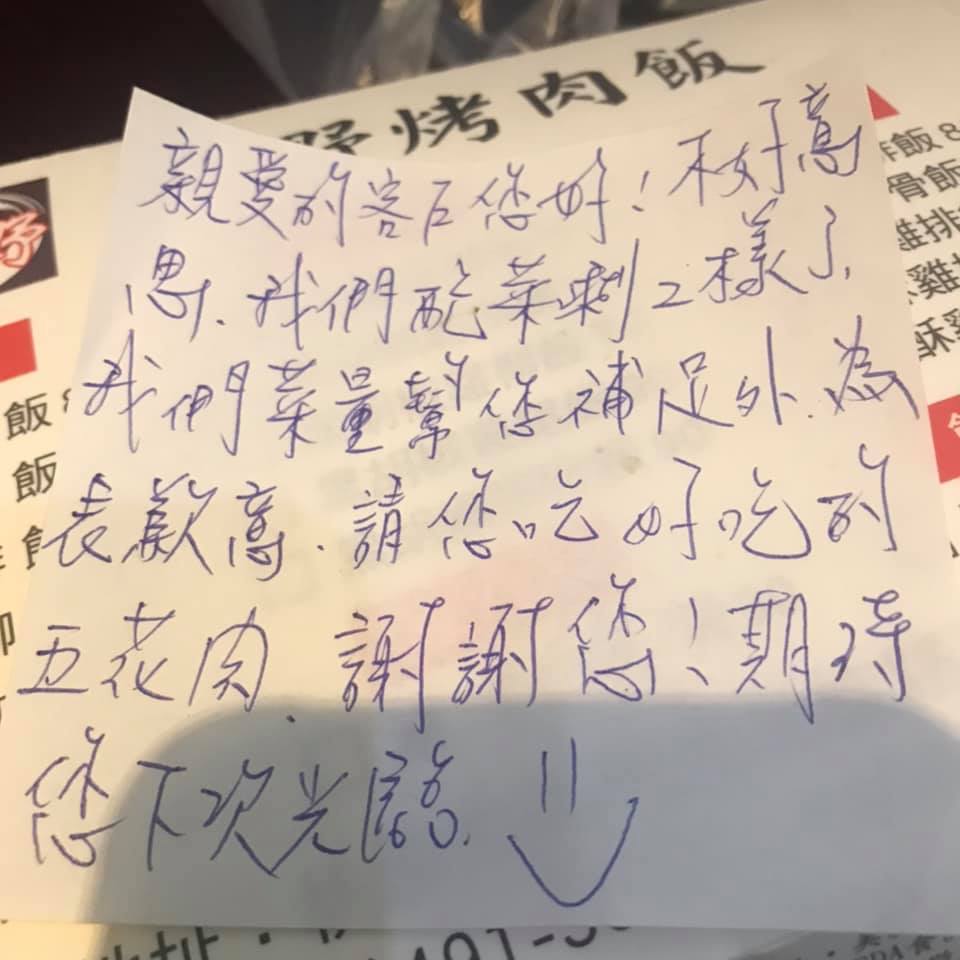 原PO在《爆怨2公社》一开头就写到「怎么有那么佛心的店家宠客人啦」,原来是她订外送点了一份排骨便当,但店家因为配菜不够,所以额外多送一盒五花肉给她当配菜。除了附上配菜之外,店家还特别手写字条,表示「不好意思,我们配菜剩2样了,我们菜量帮您补足外,为表歉意,请您吃好吃的五花肉……」超贴心的举动让原PO大赞「这种服务态度真的很不行 让很多人无法经营,我决定要用新台币抵制这种优良店家」。