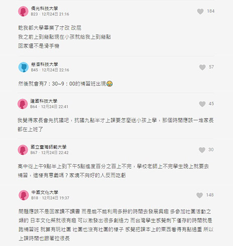 有網友將這個議題放在Dcard討論,表示樂見其成,畢竟上課時間真的有點太長,跟各國學生上課時間相比,靠近我們的日本大約6小時,給人嚴謹自律的德國也是6小時,英國、美國和澳洲大約6.5小時,俄羅斯7小時,被說學生壓力山大的南韓是8小時,競爭高的中國則是9小時,而台灣高居世界冠軍,學生上課時間9.5小時,也難怪學生精神不繼,許多人下課後還會去補習,回到家通常都很晚了,這名網友便說,雖然改上課時間很麻煩,但如果真的沒必要待在學校那麼久,不如把時間還給學生。