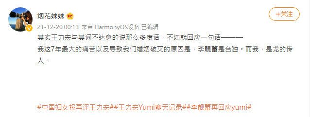 在中國西南財經大學擔任廣告學導師的網紅「煙花妹妹」,昨日在微博分享對王力宏事件的看法,他直言王力宏與其說一大串詞不達意的「廢話」,不如簡單扼要地說一句:「我這7年最大的痛苦以及導致我們婚姻破滅的原因是,李靚蕾是台獨。而我,是龍的傳人。」直接明瞭的戳中中國人最敏感的神經。