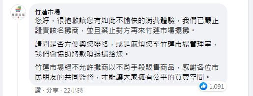 貼文曝光後,網友們紛紛怒批店家太無良,「應該報警,免得下個人受害」、「離譜了,這是騙,不是賣了」、「黑心商店」、「這已經構成詐欺了,建議下次看到同攤位,直接帶警察一起來查獲」。事件曝光後,該市場管理處回應,目前已嚴正譴責該名攤商,並將對方列為拒絕往來戶。