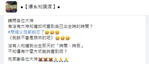一位网友在脸书社团《爆系知识家》上发问,他因为近日想改名,需要用到自己的出生时间,问爸妈结果2个人都忘了,让他一时之间怀疑起自己是不是捡来的。身边都没人知道他出生那天的「时间、时辰」,于是询问众人「不知还有什么方式能够查到呢?」