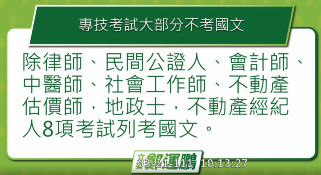 民進黨立委鄭運鵬認為國文科應該從國考科目中廢除,因為目前專技考試中除了律師、會計師、中醫師、社工師……等8項考試外,「大部分專技人員考試都不考國文科了。」