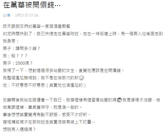 一位女網友在網路論壇《Dcard》上發文抱怨,她和朋友約在萬華一間居酒屋聚餐,眼看約定時間快到了,她快速走在街道上,突然一個陌生男子接近她問「請問多少錢?」她一時還反應不過來,男子接著問「2500嗎?」這才意識到被對方當成「站壁」女生,尷尬回「我不是在做那行的欸!」男子連忙道歉後離開。