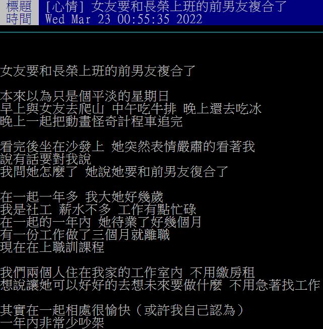 一位男網友在網路論壇PTT上發文訴苦,他本身是名社工,雖然薪水不算多,但對女友是盡力體貼照顧,在一起的一年多裡,約會出遊的費用幾乎都是他負責,甚至和女友住在自家不用付房租的工作室,讓待業已經好幾個月的她慢慢思考未來方向,不用急著找工作。