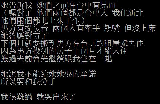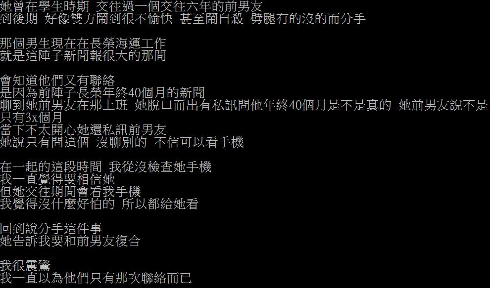 前陣子長榮海運40個月年終的新聞鬧得沸沸揚楊,原PO女友脫口而出因為這件事和交往6年的前男友聯絡,他剛好在長榮上班,於是想知道他的年終是不是向外界所傳,「她前男友說不是,只有3x個月」。之後的某天,女友突然又和他提分手,表示要和前男友復合了,坦承2人已見過面還有親密舉動,原PO不能給出她要的承諾,所以才選擇分手。