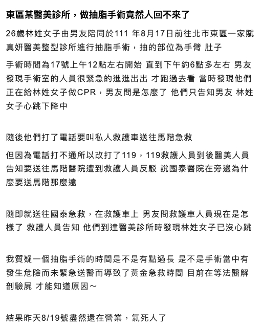 PO指出,林女隨即被送往國泰醫院,但在救護車上,林女男友詢問「現在是怎樣了 ?」救護人員卻告知「到達醫美診所時,發現林姓女子已沒心跳。」對此,原PO提出質疑,抽脂手術的時間是不是有點過長?是不是手術當中有發生危險而未緊急送醫,導致錯過黃金急救時間?目前在等法醫解剖驗屍,才能知道原因,結果819日竟然還在營業,氣死人了!」