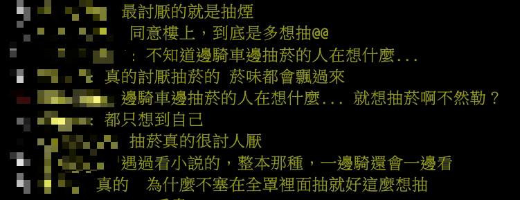 不過,最多人點名的就是「抽菸」,痛批「不知道邊騎車邊抽菸的人在想什麼?」、「真的討厭抽菸的,菸味都會飄過來」、「都只想到自己」、「抽菸真的很討人厭」、「抽菸真的很母湯」、「抽菸,影響到別人就是拉雞」、「邊騎或邊走邊抽的,真的去死」。你遇過什麼特別有趣的事嗎?也最痛恨抽菸嗎?