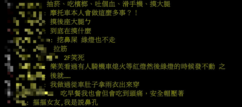 對此,許多網友都搶著分享,直呼「我也這樣吃過,太趕」、「摸後座大腿」、「挖鼻屎,綠燈也不走」、「拉筋」、「我做過從車肚子拿雨衣出來穿」、「遇過看小說的、整本那種,一邊騎還會一邊看」、「唱歌,還越唱越high」、「喝珍奶、吃地瓜球」、「大學時,下課要趕打工,又因為肚子餓,滿常一邊騎車一邊吃麵包」、「趁紅燈搭訕」、「以前看過阿北在看報紙」、「唱歌+搖擺,開個人演唱會」。