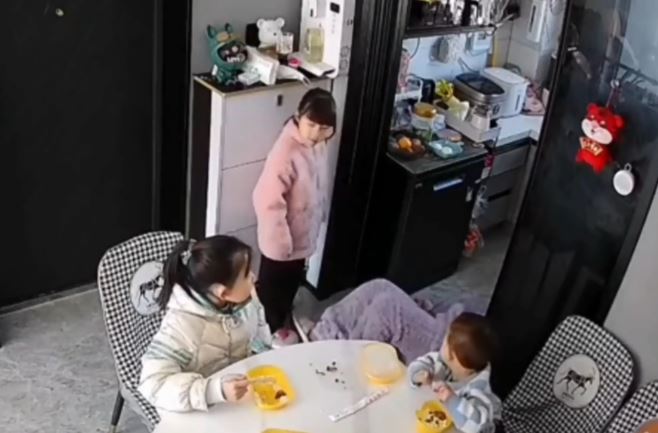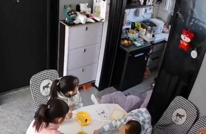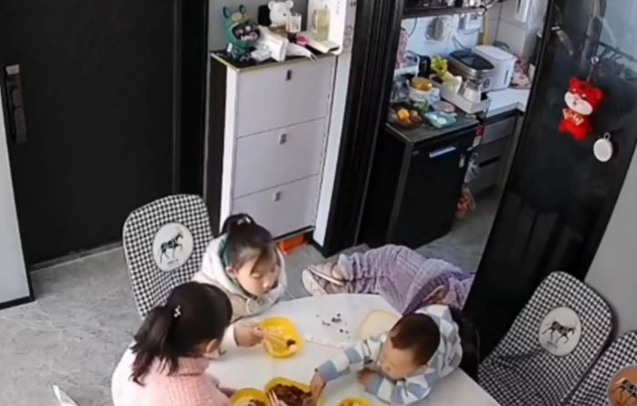 根據中國媒體《星視頻》的報導,中國江蘇省無錫市一名女子確診在家照顧3個孩子,孩子們正在餐桌用餐,但她疑似身體不適,試圖伸手想抓住櫃子,仍體力不支向後摔倒躺地。