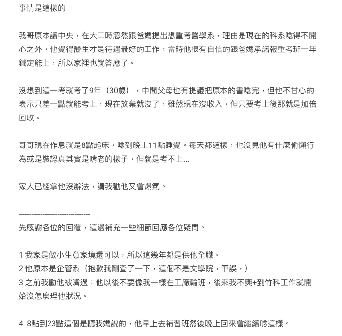 原PO在Dcard以「哥哥重考第9年了」为题表示,哥哥原本读中央大学企管系,大二时,跟爸妈提出想重考医学系,除了唸得不开心之外,也觉得当医生才是待遇最好的工作,并自信地承诺,「报重考班一年铁定能上」,所以爸妈就答应,由于家中经营小生意,家境还可以,哥哥不必担心日常开销。