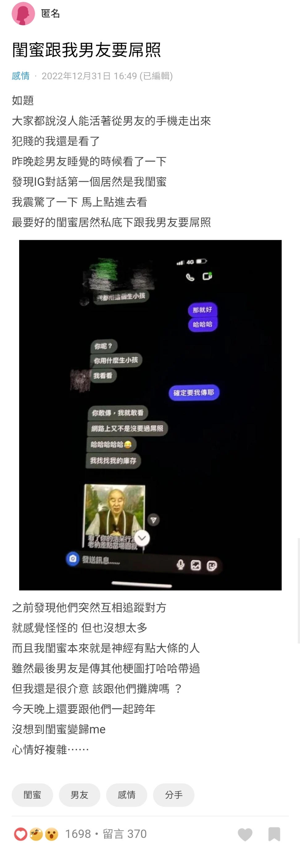 女卡友到Dcard感情版尋求建議,表示自己閨密本身是神經大條的人,先前發現閨密和男友突然互相追蹤Instagram有點怪,但是也沒想太多。這天原PO翻男友手機驚見最要好的閨密竟然向男友討小弟弟照。對話中閨密傳圖片喊「我都用這個生小孩」,接著反問男友:「你用什麼生小孩?我看看」。只見男友回答:「確定要我傳耶」,閨密則表示敢傳就敢看,她在網路上也要過其他人的小弟弟照。雖然最後男友傳梗圖帶過,但原PO看完很介意,不知道該不該攤牌。