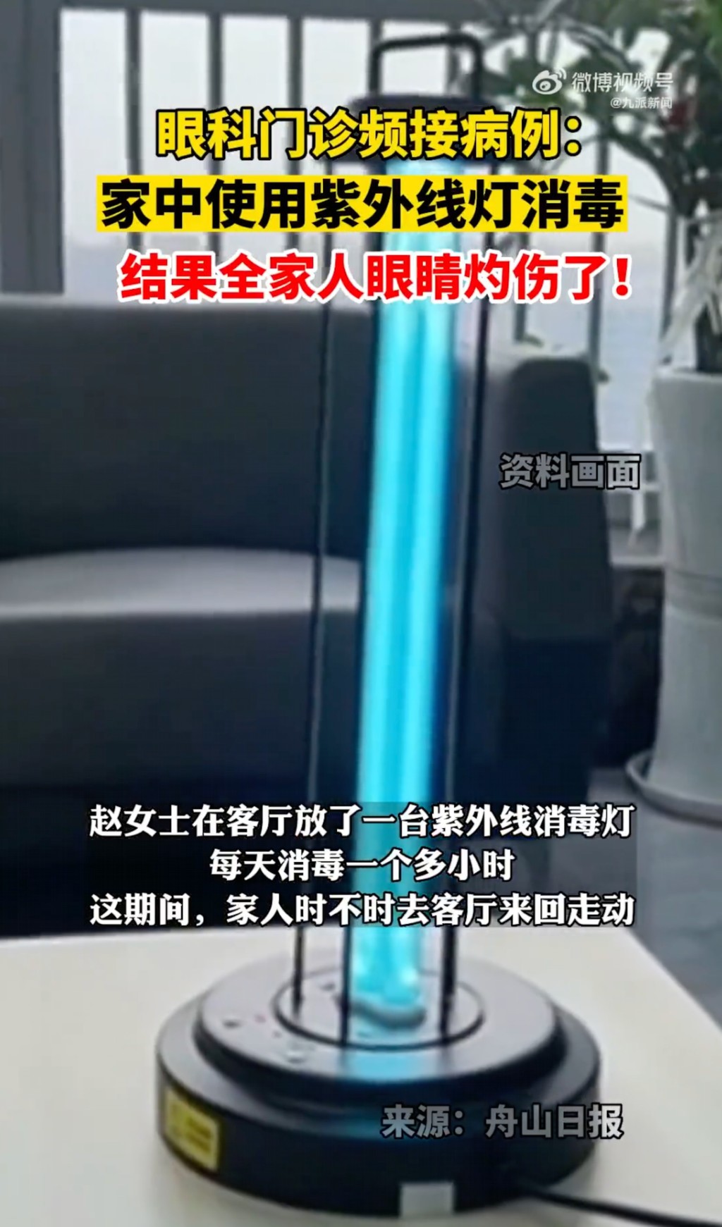 根據中國媒體《網易新聞》的報導,中國浙江一名趙姓女子因為周遭親友一一確診,為了給家裡進行全方位的消毒,於是購買了一台紫外線消毒燈放在客廳,並每天開啟至少1小時殺菌。不過女子和老公、女兒在使用紫外線消毒燈時,並沒有迴避,仍然在家中走來走去,沒多久全家就出現眼睛紅腫、刺痛、畏光、睜不開的症狀。