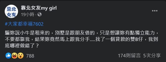 這位被甩的男網友上臉書社團《靠北女友my girl》抱怨,原本只是希望女友能獨立一點,不要凡事靠他,「騙妳說小牛 (知名跑車) 是租來的,別墅是跟朋友借的」,結果女友馬上提分手,還「找了一個貸款的雙B仔」。原PO無奈喊冤,不理解自己哪裡做錯了。