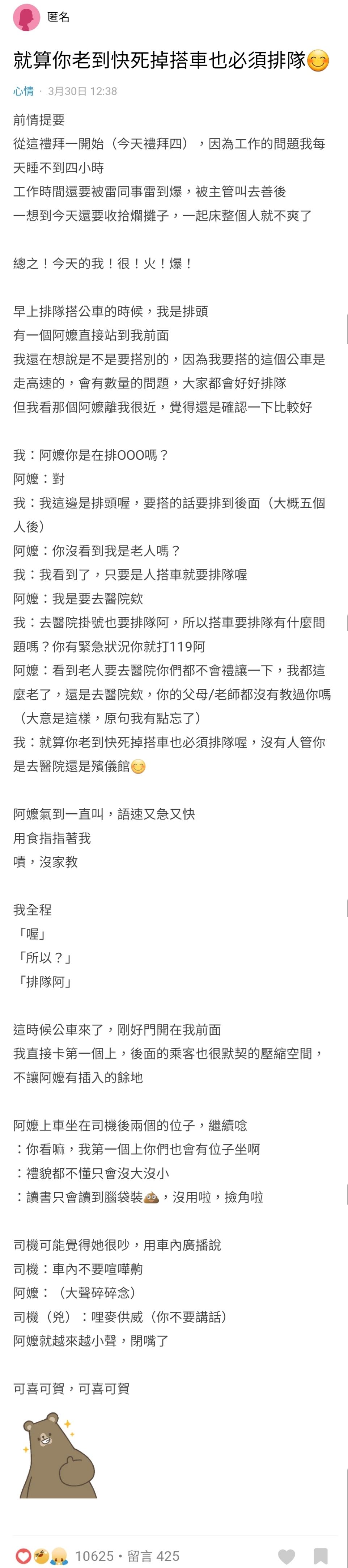 原PO確認阿嬤要搭同一班公車後,提醒她要走到約5名乘客後依序排隊,結果阿嬤開始倚老賣老,稱自己是要去醫院的老人,想藉此享有插隊特權。原PO耐心解釋到醫院掛號也是得排隊,如有緊急情況可以打119。阿嬤自以為是教訓年輕人不禮讓老人,原PO忍無可忍:「就算你老到快死掉搭車也必須排隊喔,沒有人管你是去醫院還是殯儀館」。