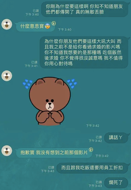 原PO繼續痛罵,覺得男友很沒誠意,之前給他看過影片,自己喜歡的求婚是,把對方父母、朋友全部叫來,大家聚在一起,一切都是自己佈置、自己準備,然後有影片、有蛋糕,「誰能接受就吃個飯,然後拿朵花,甚至戒指只有8萬多,雖然男友也有做個短影片,但感覺就是臨時拿照片湊一湊的,真的好煩!」對此,原PO感嘆,只有一次的求婚,被男友這樣亂搞,回家的路上就想分手,都在一起4年,還這麼沒誠意。此外,從原PO附上的對話截圖可以看到,她仍怒氣未消,不停地質問男友「為什麼你朋友要這樣大吼大叫?」、「我媽也覺得你很隨便」、「第一次聽到有人約女朋友在餐廳吃飯就求婚」、「也不是什麼對我們有意義的餐廳」,男友連忙道歉「不知道妳不喜歡這樣,我重新安排好嗎?」原PO無法接受,反嗆「有人求婚求2次的?而且這麼爛的場面,請我朋友來看笑話嗎?」