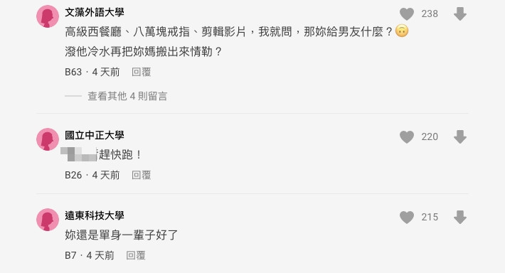 然而,一票網友看到後,紛紛力挺男主角,將砲口對向原PO,直呼「還好求婚失敗,上輩子應該有燒好香」、「恭喜,台灣還有很多很棒的女生」、「有餐廳主管能幫忙喬位子喬場地,甚至還能給折扣,而且是星級餐廳,沒道理選別家吧?」、「你完全不需要被這樣子罵,你值得更好的」、「戒指還人家,然後趕快分手」、「高級西餐廳、8萬塊戒指、剪輯影片,我就問,那妳給男友什麼?潑他冷水再把妳媽搬出來情勒?」、「拜託放過妳男友,他值得更好的」、「什麼樣的家庭教育出什麼樣的人」。若你是男友的角色,會道歉還是提分手呢?