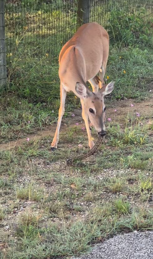 大家有沒有去過日本奈良或是台灣一些特別的農場餵過鹿鹿呢?除了青草,品種不同的鹿也會吃紅蘿蔔或地瓜等不同的食物,根據奈良市觀光協會介紹,奈良公園也會販售小麥粉和米糠做成的零食「鹿仙貝」讓遊客餵鹿。最近美國德州一位駕駛開車時發現路邊有隻野鹿,看牠咬著「一條繩子」便好奇停車錄影,未料鏡頭拉近後發現出乎意料的現象!