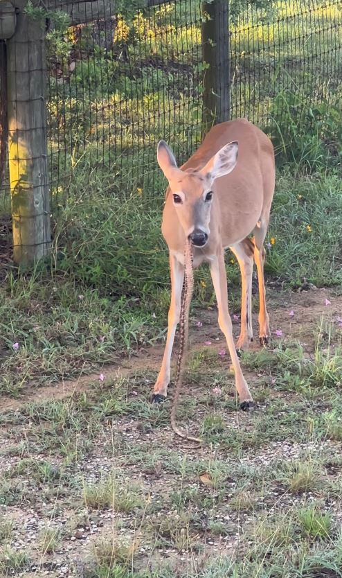 拍攝者特雷·萊恩哈特 (Trey Reinhart) 觀察了一下才看出不對勁,在影片中忍不住驚訝問道:「你在吃蛇嗎?」原來鹿鹿並不是撿到麻繩無聊叼起來咬一咬,而是正在咀嚼一條活生生的蛇啊!