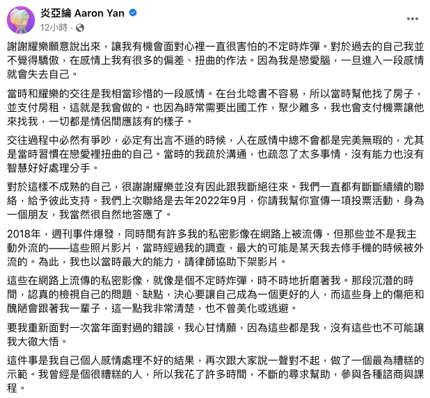 事后,炎亚纶发出道歉声明,内容提到,私密片可能是某天去修手机时被外流的,并非自己主动,有请律师协助下架影片。最后,炎亚纶向耀乐喊话,「如果你愿意的话,我愿意再当面跟你道歉,也愿意陪你走过一切的伤痛,和进行后续能弥补的一切。」