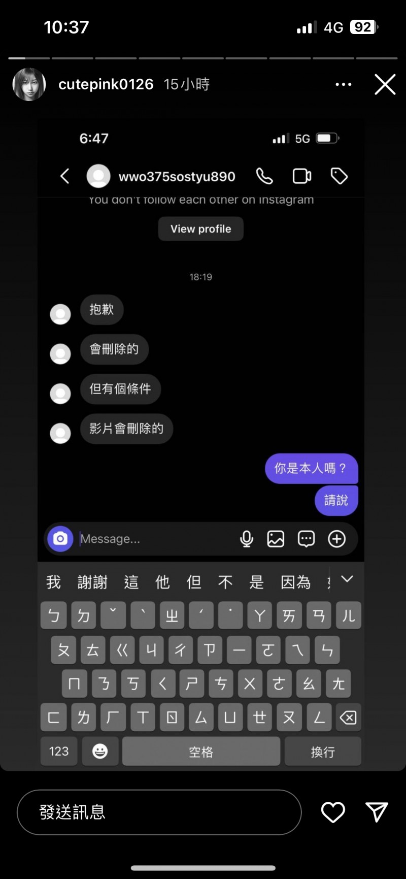 據悉,星宣7月1日在IG發布限時動態,流出多張對話截圖,提及有匿名帳號前來道歉、求和,寫下「抱歉,會刪除的,但有個條件,影片會刪除的」,還將自己約到工作室,承諾會當面刪除。對此,星宣直言「我知道是你」,似乎認定這就是酷炫的帳號。