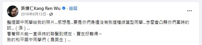 由於不少粉絲紛紛敲碗帥同學的近照,吳慷仁應觀眾要求曬出合體國中同學的對比照,只見校草級的同學如今都豐腴不少,戴上黑框眼鏡也顯得成熟許多,當年青澀模樣已不復見。吳慷仁也特地為朋友說話,「必須說,跟現在的我 (體型) 拍照對他們來說很不公平,但他們現在身為孩子 (加起來4個) 的爸,他們早已沒有包袱、自由自在的生活 (體型上也較奔放)」。