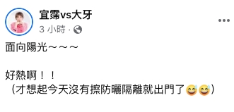 大牙在贴文中写下「面向阳光~~~好热啊!」并笑说「才想起今天没有擦防晒隔离就出门了!」