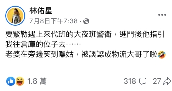 7月8日晚间,林佑星买完东西要回家,拉着堆满纸箱的推车走进大门,刚好当天是由代班警卫站岗,对方完全认出来,将其被误认成物流大哥,看了一眼,就指引他往仓库的位子去,「老婆在旁边笑到嘿姑!」