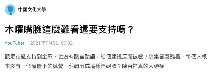 原PO看見後,痛批「觀眾花錢支持到金扇,也沒有酸言酸語,給個建議反而被嗆?這集節奏難看,每個人根本沒有一個屋簷下的感覺,剪輯剪成這樣怪觀眾?陳百祥真的大頭症!」