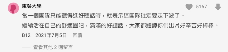 其餘網友紛紛附和「當一個團隊只能聽得進好聽話時,就表示這團隊注定要走下波了! 繼續活在自己的舒適圈吧!滿滿的好聽話,大家都體諒你們出片好辛苦、好棒棒。」