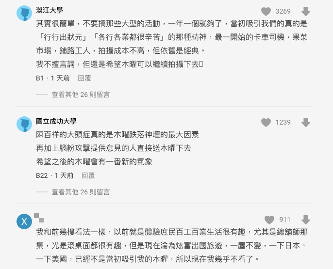 貼文曝光後,大家都在留言處表達自己的看法,「其實很簡單,不要搞那些大型的活動,一年一個就夠了」、「陳百祥的大頭症真的是木曜跌落神壇的最大因素,再加上腦粉攻擊提供意見的人,直接送木曜下去,希望之後的木曜會有一番新的氣象」、「有意見的一律打成酸民,真的以為自己多了不起」、「他看到這篇只會覺得Dcard都酸民而已,希望他可以不要那麼自以為是」、「其實就大型企劃太多,偏離原本太多,流量沒想像中的好,造成一些虧損」。