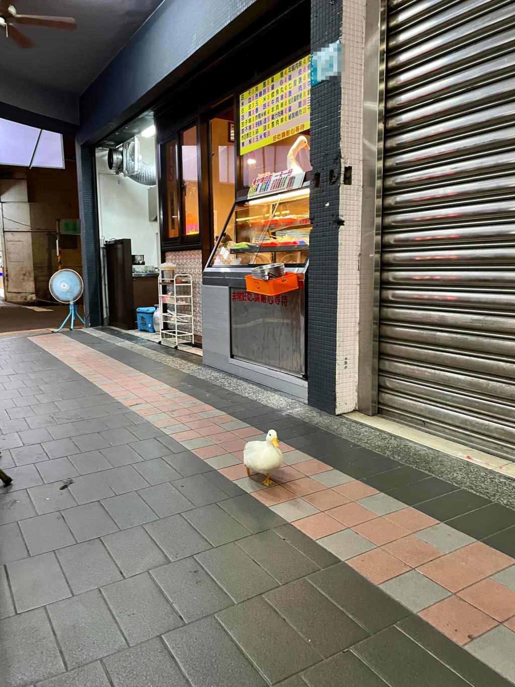 在骑楼巧遇白色柯尔鸭的网友拍下照片,分享至脸书社团《路上观察学院》,隔空对鸭鸭喊话警告:「喂,不要再过去了,这边是一家东山鸭头啊!」画面上鸭鸭看起来很安心,殊不知旁边就是一间有卖鸭肉的店家,摊位贴出标语「非常好吃,请耐心等待」,店口还摆了一只「鸭学长」。