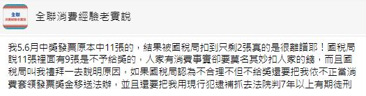 一名網友在臉書社團《全聯消費經驗老實說》上大吐苦水,表示自己5、6月發票中獎11張,結果被國稅局告知有9張不予給獎,還被要求到場說明消費原因,若是國稅局覺得說法不合理,就會依「不正當消費套領發票獎金」將他移送法辦,並以現行犯逮補判7年以上有期徒刑,讓他氣得直呼「人家有消費事實卻要莫名其妙扣人家的錢,真的是很離譜耶!」