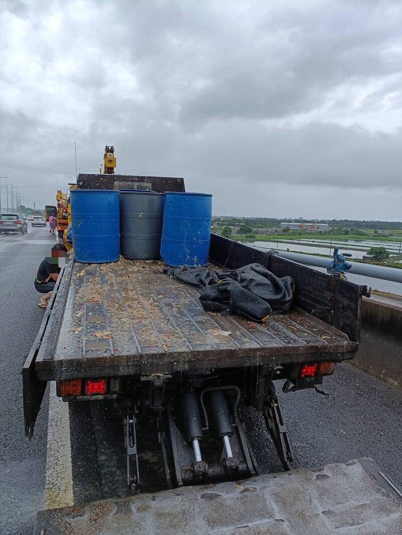 根據《自由時報》報導,39歲陳姓男駕駛開著黑色轎車,疑似打滑撞到內側護欄停下來,後面28歲李姓男貨車司機追撞,車上廚餘桶滿天飛。國道警竹田分隊指出,兩位駕駛都不是酒駕,也沒有送醫。警方提醒駕駛在天候不佳時注意路況,更要適度增加安全距離,保護自己和他人行車安全。